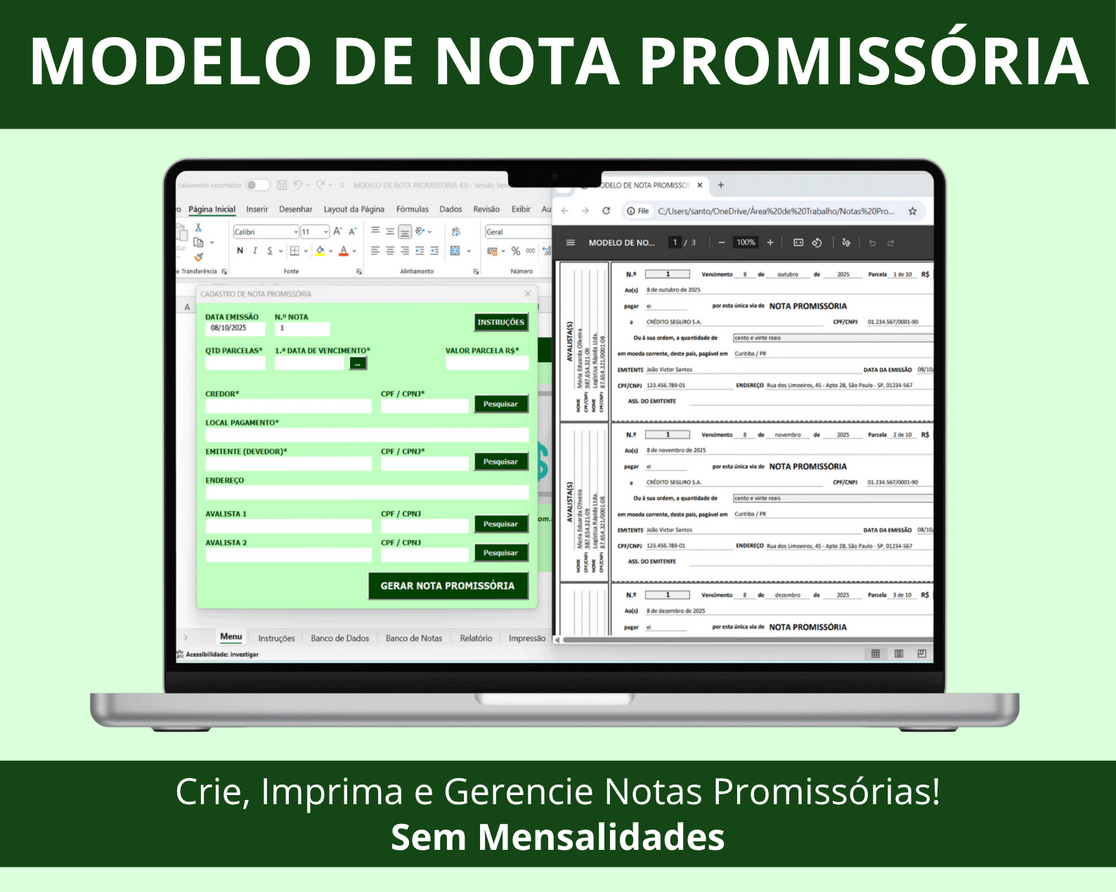 A Planilha de Nota Promissória é incompatível com o Excel para Mac, Google Planilhas ou qualquer outro software que não seja o Microsoft Excel em Português para Windows (Versão 2010 ou versões superiores).