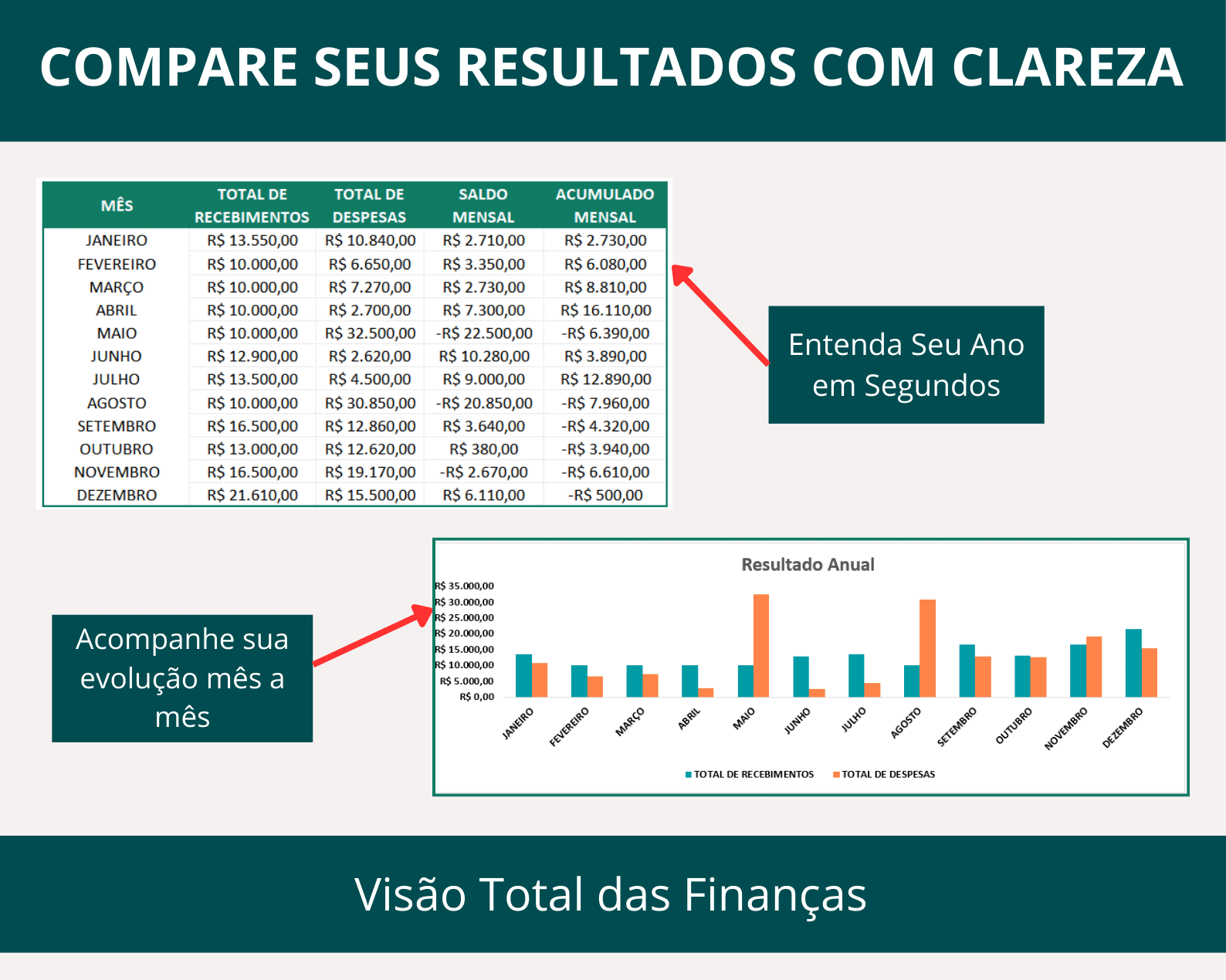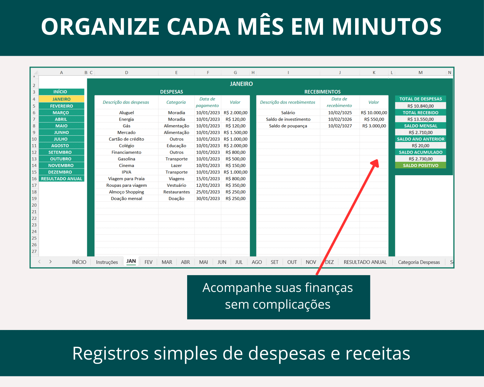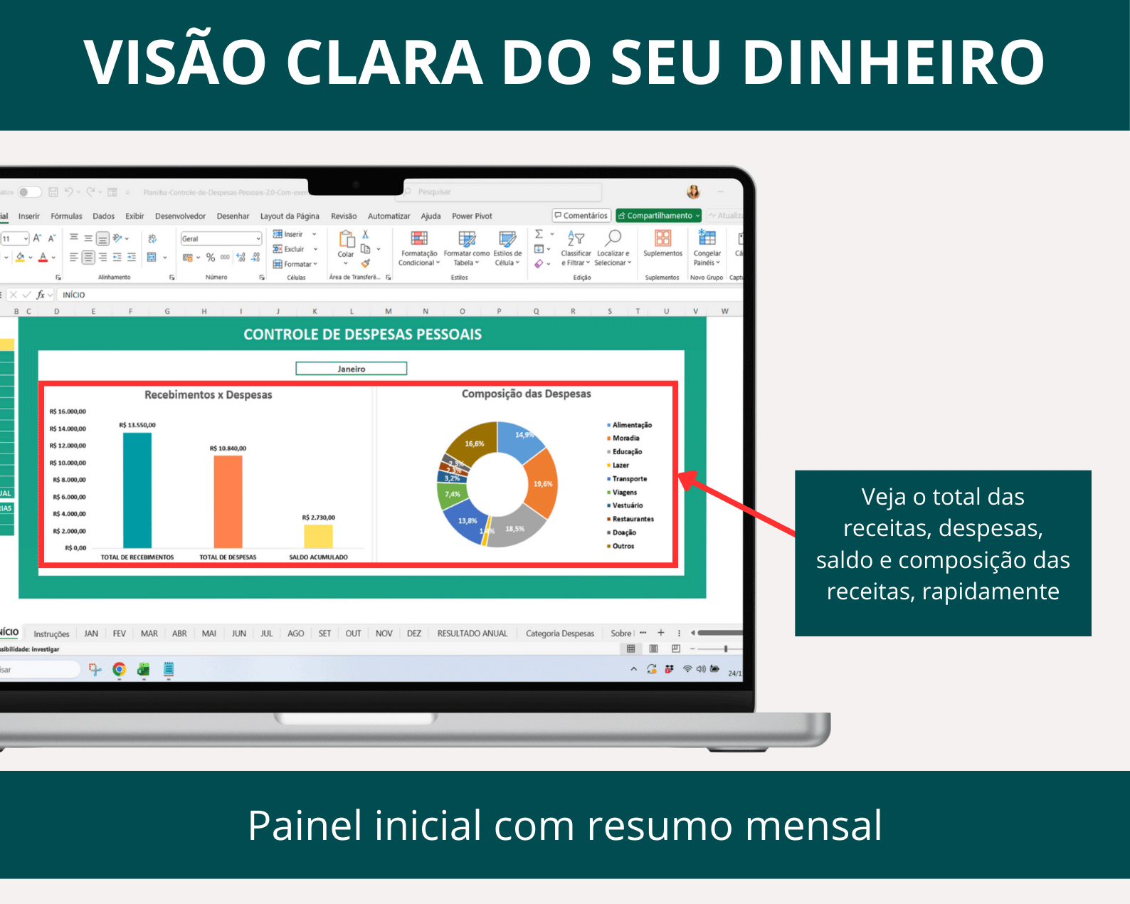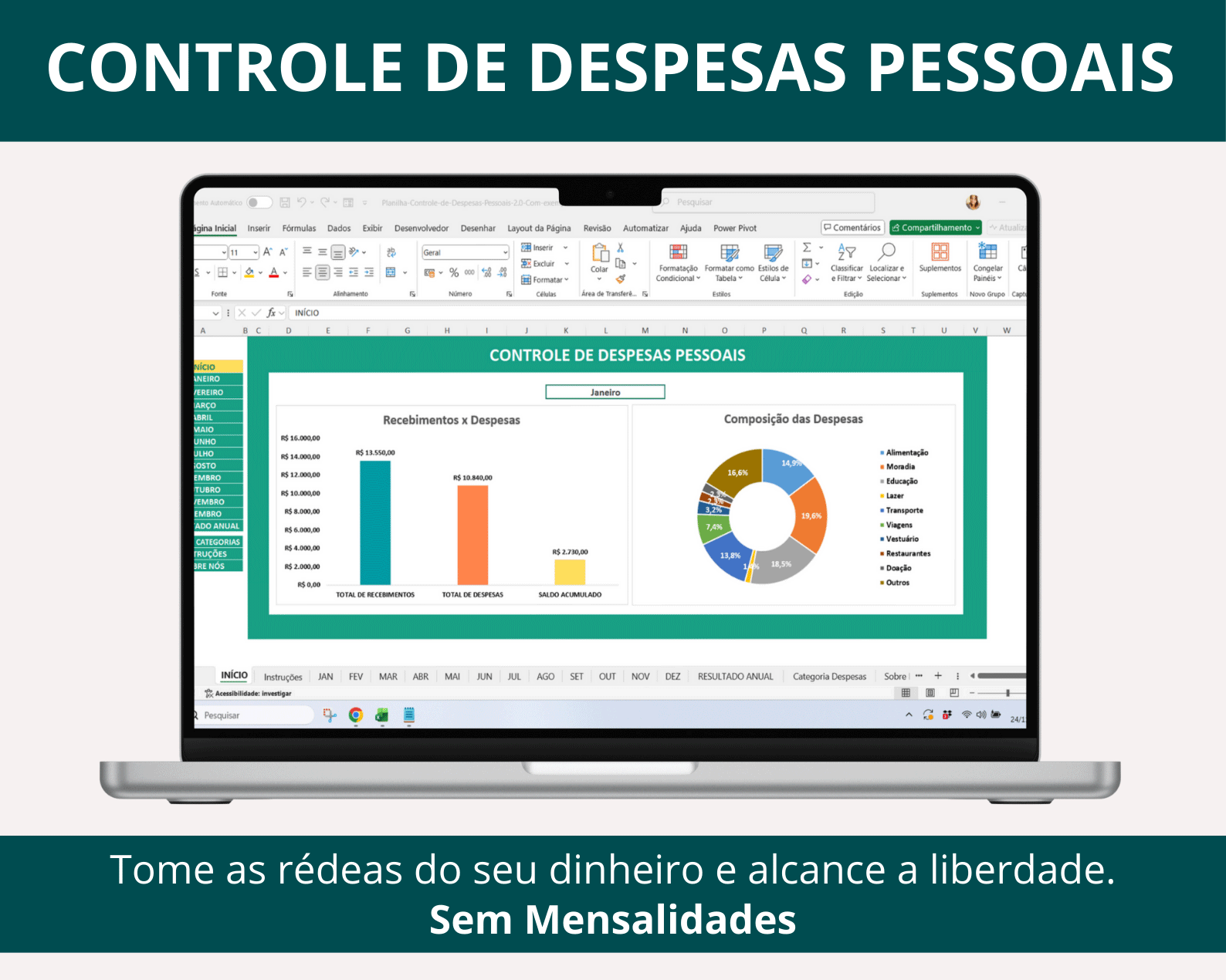 Organize seus gastos com facilidade usando a Planilha de Controle de Despesas, disponível em versão para Excel e Google Planilhas. Acompanhe receitas, despesas e saldo mensal com gráficos automáticos e categorias personalizáveis. Simples de usar, visual e ideal para quem deseja ter um controle financeiro mais claro e eficiente no dia a dia.