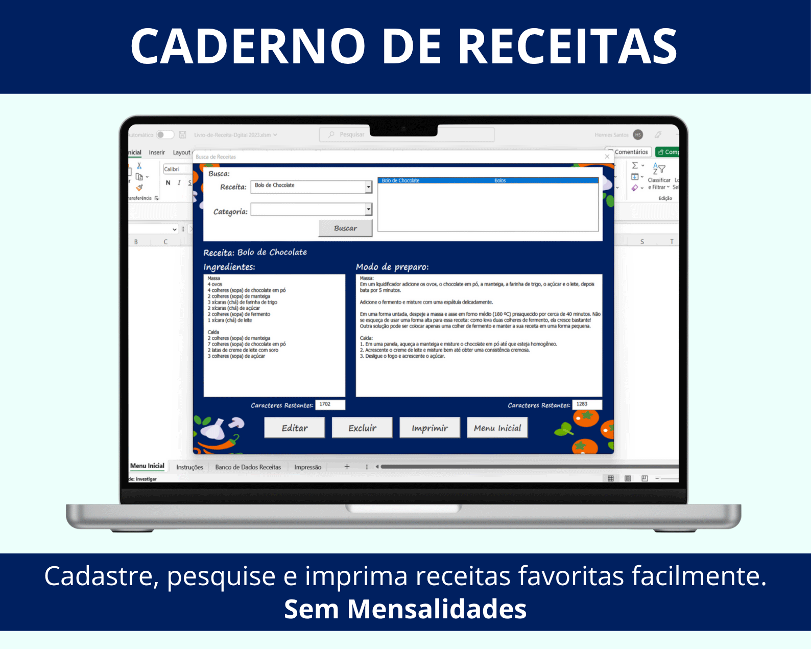 Se você adora guardar suas receitas favoritas, então você vai gostar da Planilha de Caderno de Receitas. Nela você poderá cadastrar, editar/excluir e imprimir as suas receitas preferidas, dando adeus ao caderninho de receitas que muitas vezes acaba se perdendo no fundo da gaveta.
