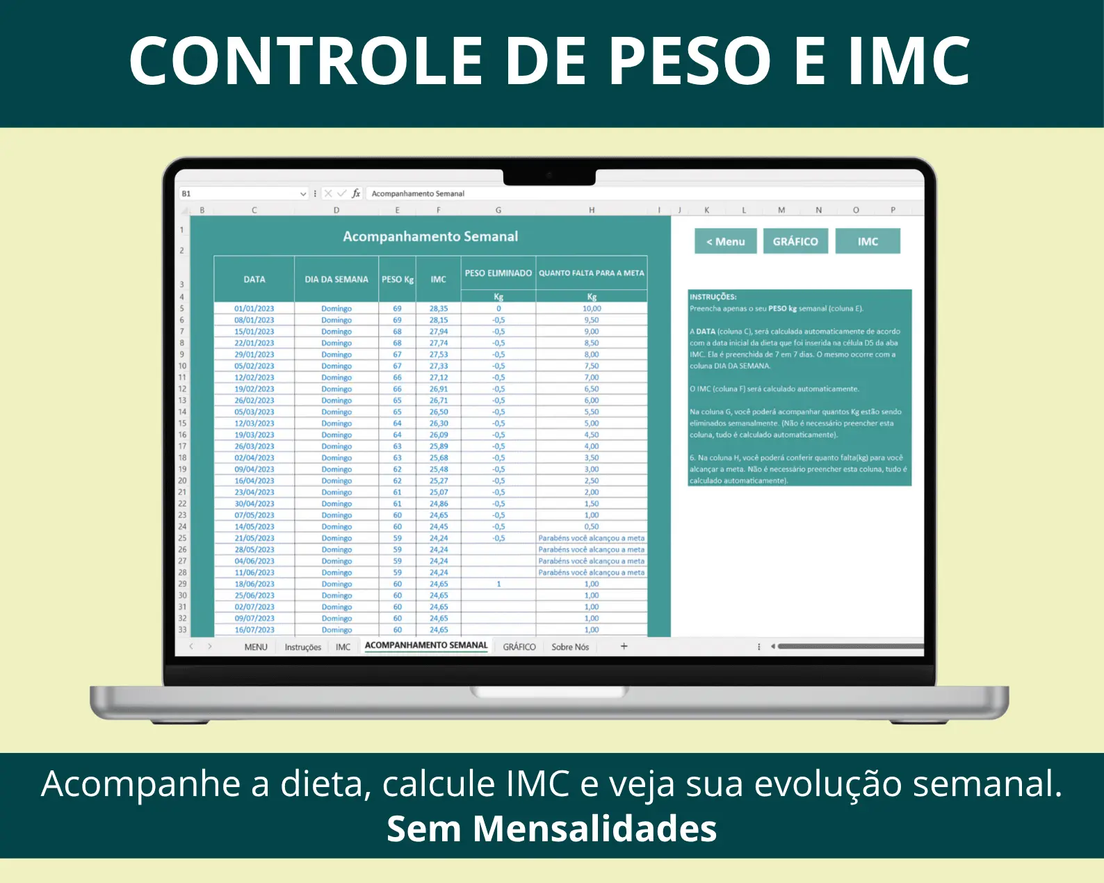 Nesta guia você deverá preencher apenas o seu peso em casa semana e a planilha mostrará automaticamente as demais informações.