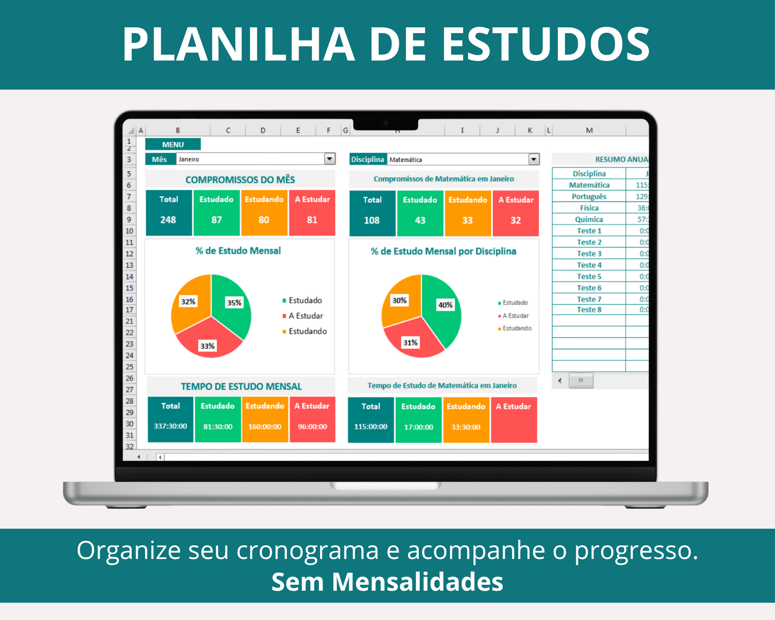 Ao adquirir a Planilha de Estudos Premium, você passará a ter acesso a uma ferramenta completa para gerenciar seus estudos de maneira prática.